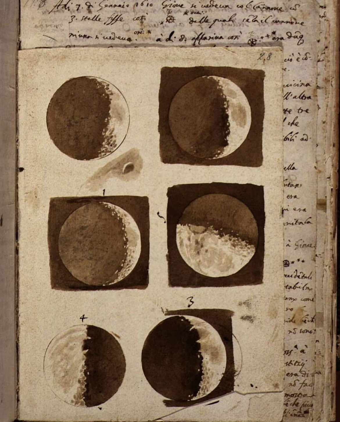 These are the first detailed drawings of the moon by Galileo Galilei after he observed them through his homemade telescope in 1609.
